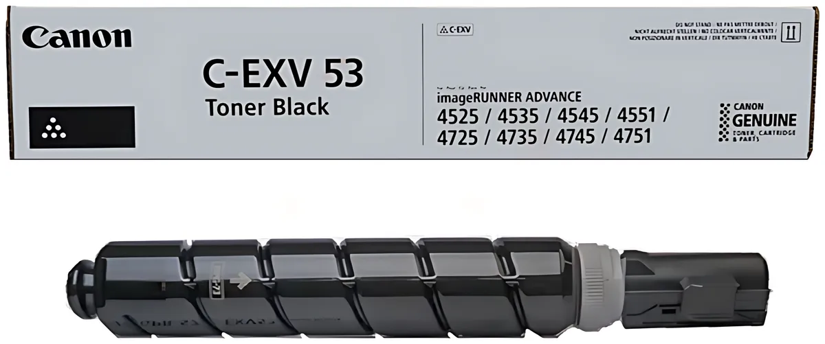 Die Herstellernummer Canon C-EXV53 / 0473C002 bezeichnet ein Verbrauchsmaterial des Typs Toner, das in bestimmte Drucker passt, darunter z. B. "Canon imageRUNNER Advance 4500 Series", "Canon imageRUNNER Advance 4525 i" und "Canon imageRUNNER Advance 4525 i II". Die Komponente hat die Farbe schwarz und eine erwartbare Reichweite von 42.100 Seiten.