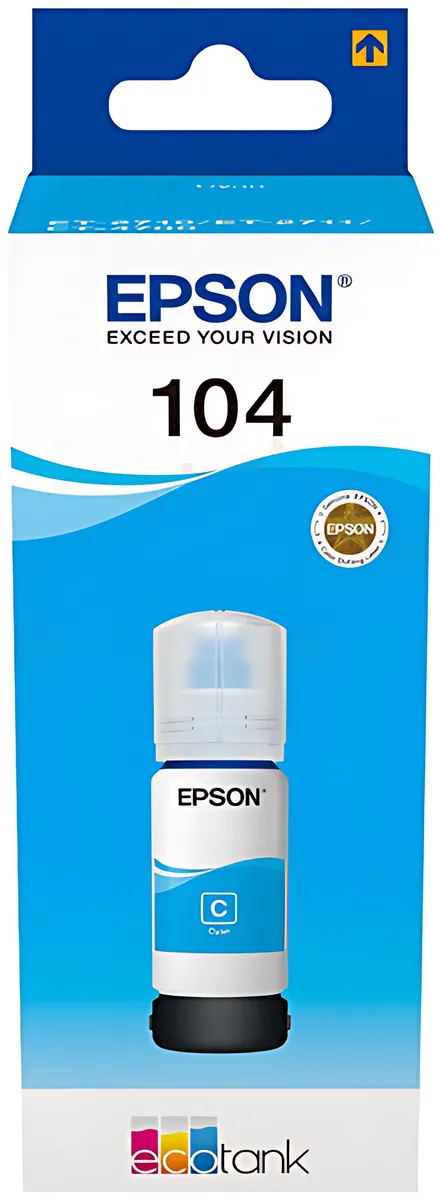 Die Herstellernummer Epson 104 / C13T00P240 bezeichnet ein Verbrauchsmaterial des Typs Tintenflasche, das in bestimmte Drucker passt, darunter z. B. "Epson EcoTank ET-14100", "Epson EcoTank ET-1810" und "Epson EcoTank ET-2710". Die Komponente hat die Farbe cyan, eine erwartbare Reichweite von 7.500 Seiten und einen Inhalt von 65 ml.
