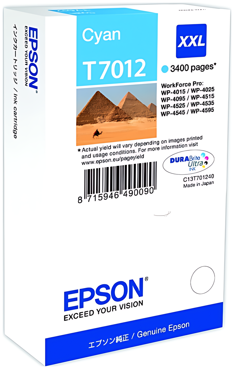 Epson C13T70124010/T7012 Tintenpatrone cyan XXL, 3.400 Seiten ISO/IEC 24711 34.2ml - Hohe Kapazität für gestochen scharfe Ausdrucke.