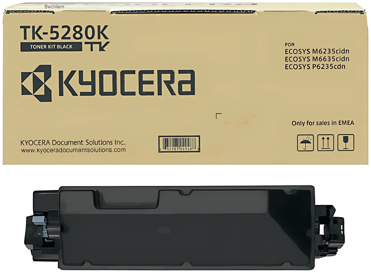 Die Herstellernummer Kyocera TK-5280K / 1T02TW0NL0 bezeichnet ein Verbrauchsmaterial des Typs Toner, das in bestimmte Drucker passt, darunter z. B. "Kyocera ECOSYS M 6235 cidn", "Kyocera ECOSYS M 6235 cidnt" und "Kyocera ECOSYS M 6635 cidn". Die Komponente hat die Farbe schwarz und eine erwartbare Reichweite von 13.000 Seiten.
