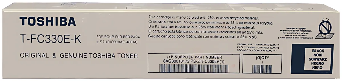 Die Herstellernummer Toshiba T-FC330EK / 6AG00009135 bezeichnet ein Verbrauchsmaterial des Typs Toner, das in bestimmte Drucker passt, darunter z. B. "Toshiba E-Studio 330 AC" und "Toshiba E-Studio 400 AC". Die Komponente hat die Farbe schwarz und eine erwartbare Reichweite von 18.400 Seiten.